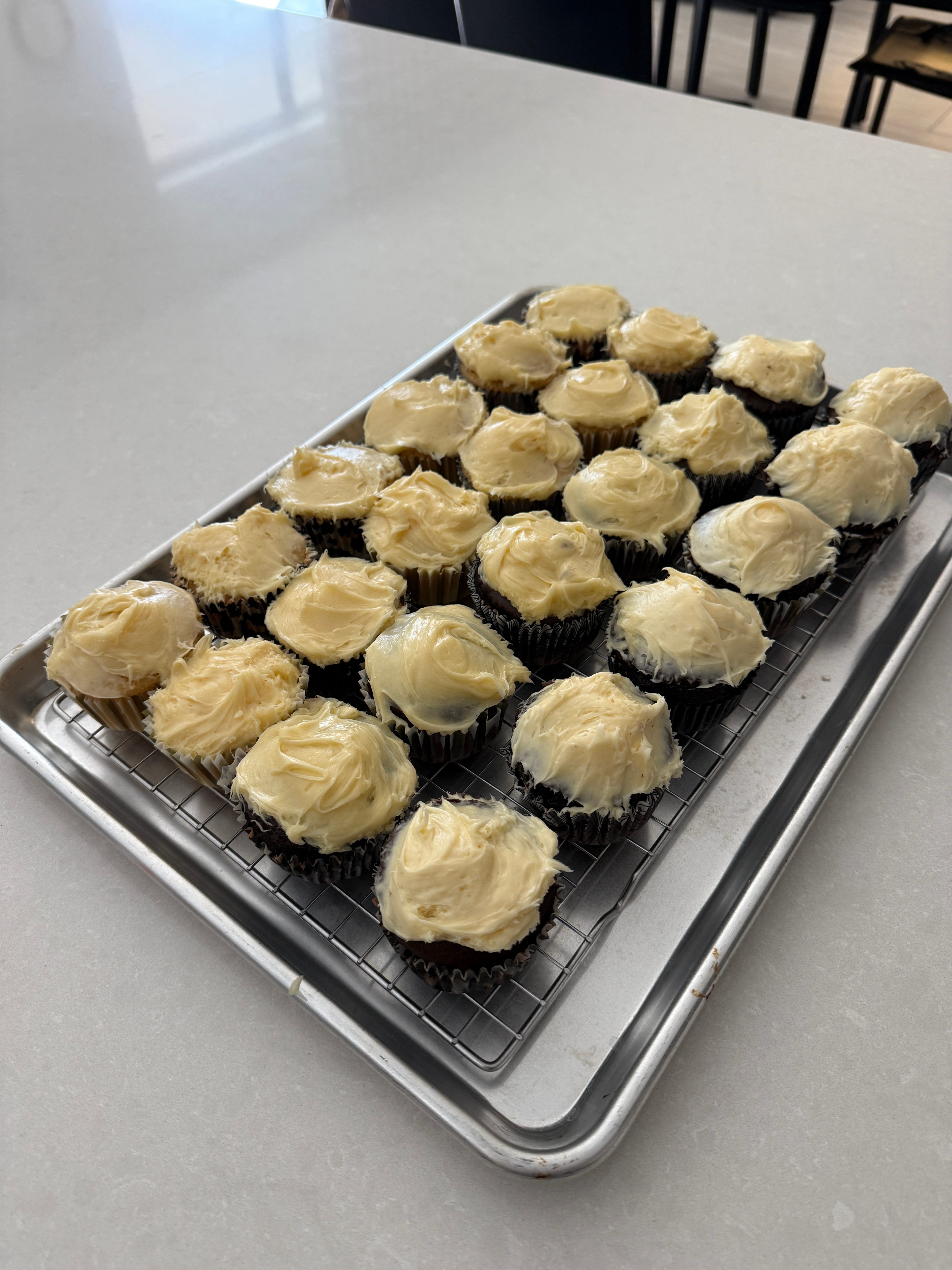 The hard part in this project was that Matthew wanted to help. I gathered ingredients and put the cupcake liners into the forms. We mixed the ingredients using the Krups mixer Mom bought for me in 1987. We poured the batter into the cups, and we put the forms into the preheated oven. Once those were done, we did the same for the second batch. The next morning, I frosted them, sans my little boy helper—no sense in inviting a kitchen disaster.
